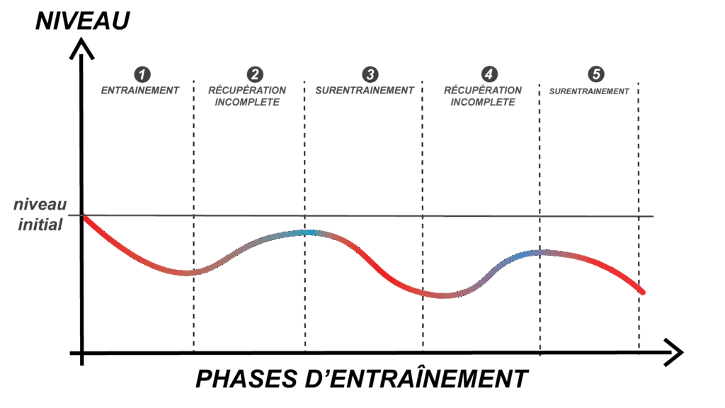 - Soit le temps de récup a été insuffisant. Ton corps n’ayant pas totalement récupérer va être soumis de nouveau à un stress qui te plongera à un niveau inférieur de l’initial. C’est ce que l’on appelle le phénomène de surentrainement.