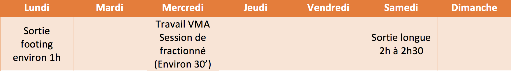 Si tu débutes il faudra envisager un minimum de trois entrainements par semaines répartis de manières stratégiques ou tu étaleras footing, travail de VMA et sortie longue. Il est possible d’envisager plus de séances par semaine mais je te conseillerais plutôt d’y aller progressivement autant pour la motivation que pour éviter les blessures.