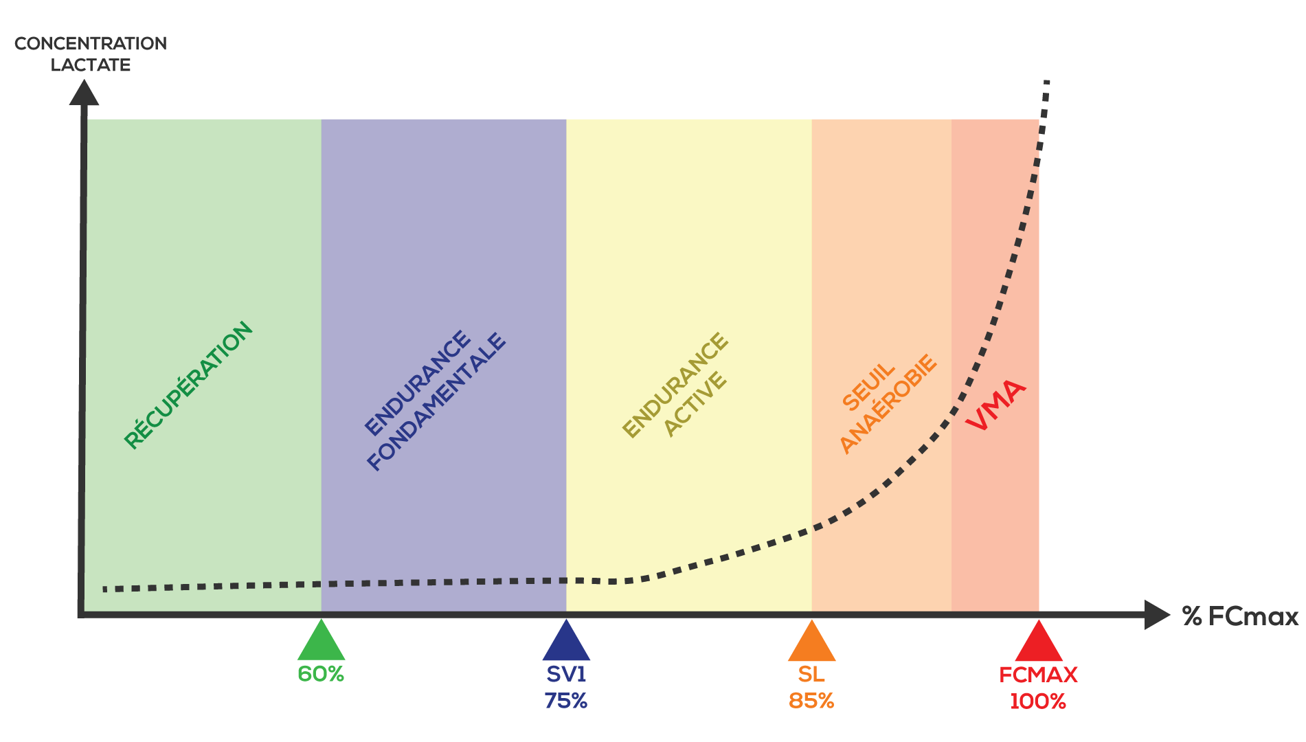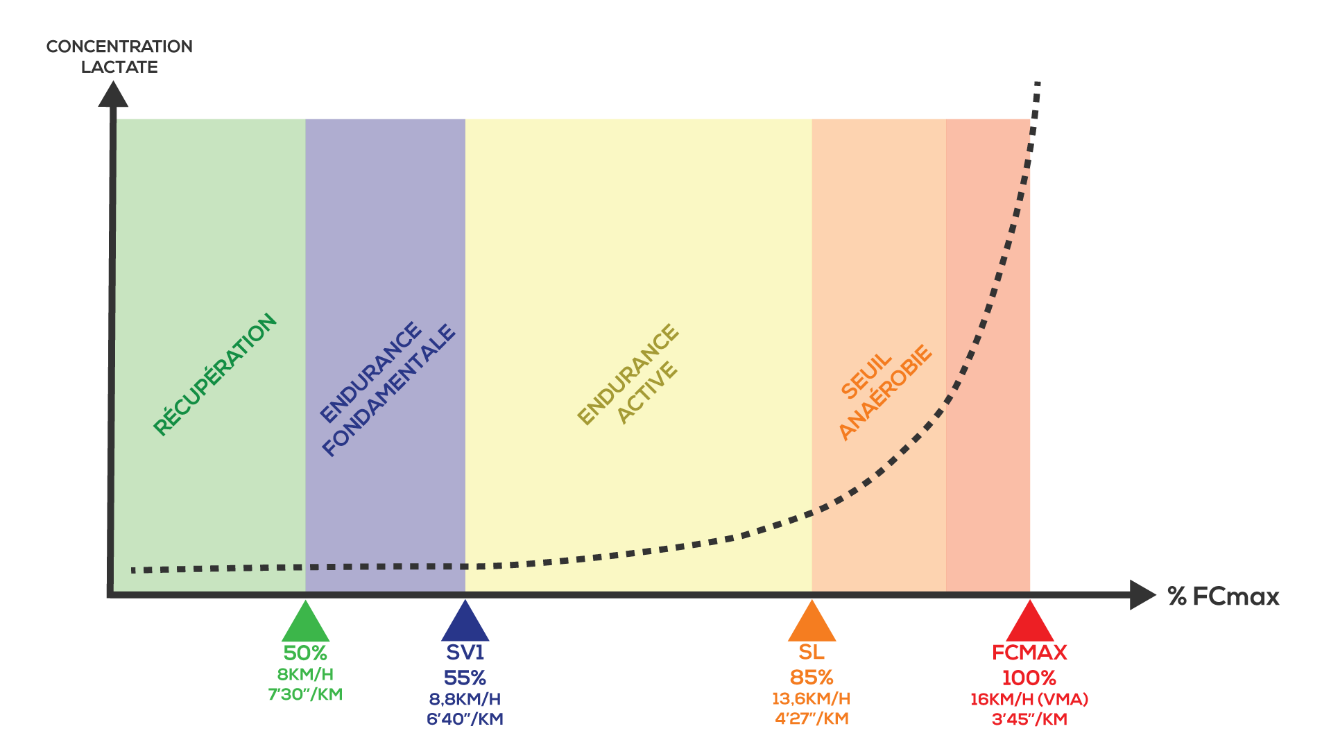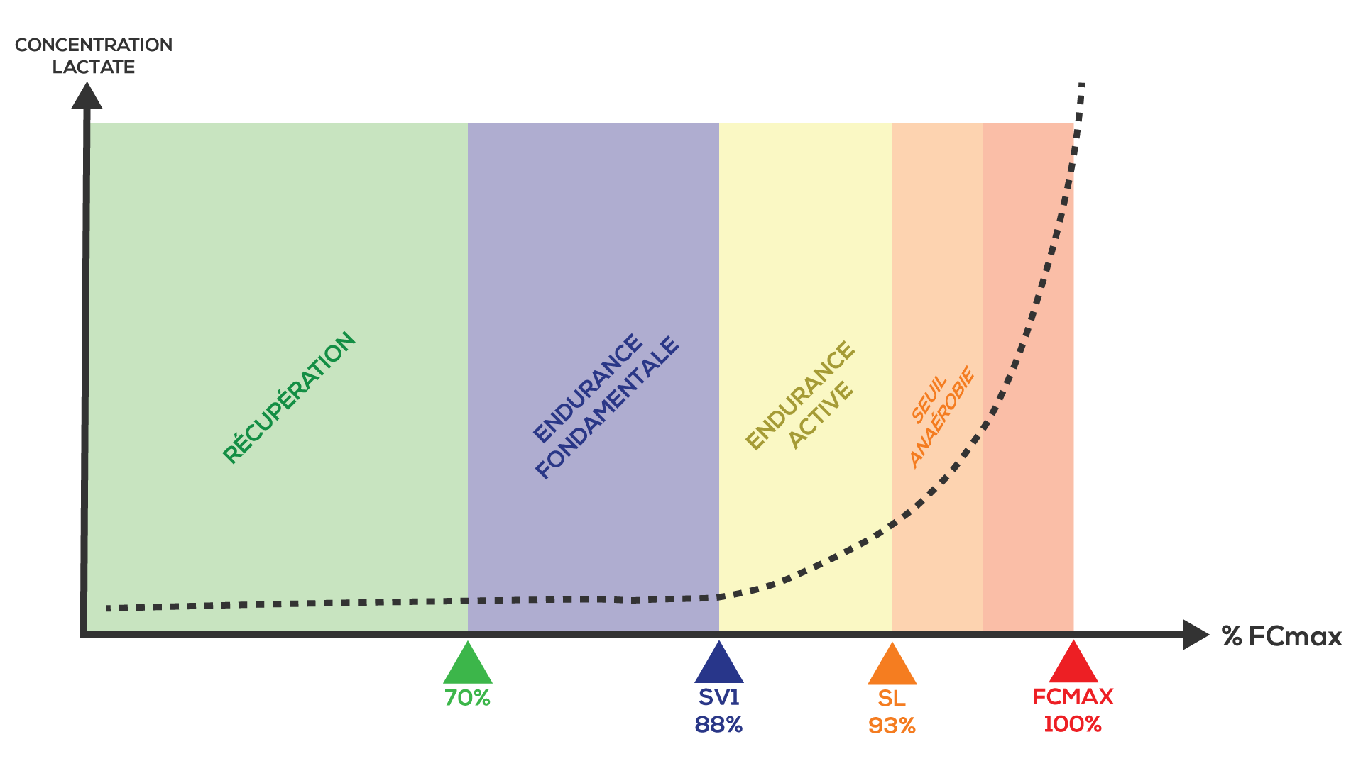 Le graphique ci-dessous représente les différentes zones d’intensité et de la contraction de lactate en fonction du pourcentage de la FCmax. Il s’agit là de valeurs standards. Le SV est à environ à 75% de la FCmax alors le SL à 85%. Mais il s’avère que ces seuils peuvent se déplacer et c’est exactement ce que l’on cherche en s’entraînant. En effet, le but est de décaler ce SV et ce SL vers la droite de sorte à repousser un maximum le seuil d’accumulation de lactate et ainsi pouvoir optimiser les performances aussi bien en vitesse qu’en économie d’énergie.