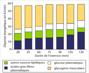 Répartition de la dépense énergétique en fonction de la durée de l’effort pour un exercice modéré (50% de la puissance maximale). D’après van Loon et al. 2003)