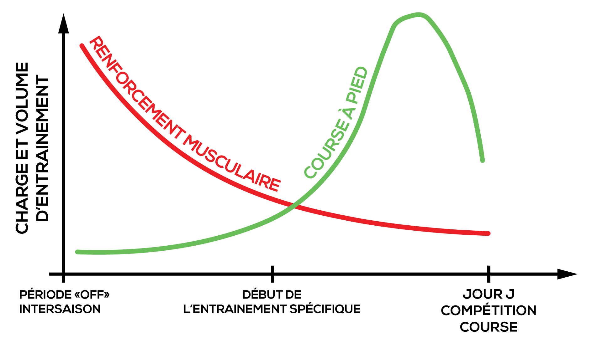 Comme je l’expliquais précédemment, les périodes « off » sont idéales pour travailler le renforcement musculaire où les volumes et charges d’entraînement pourront être les plus élevés. Outre la proprioception et le gainage, ce sera l’occasion de travailler la force et la puissance. En parallèle, en course à pied, on prendra le temps à ce moment-là, de faire des séances de qualité axées sur la vitesse.
