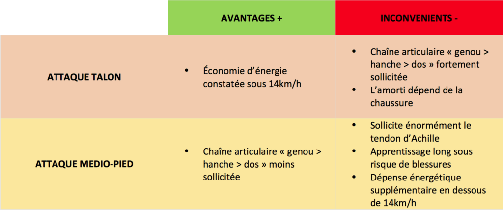 Récapitulons dans le tableau ci-dessous les avantages et les inconvénients de l’attaque talon et medio-pied