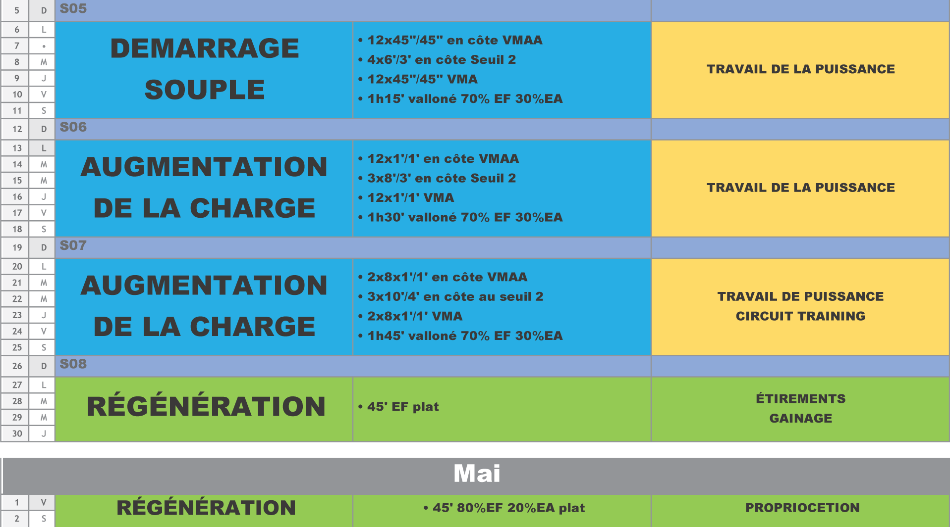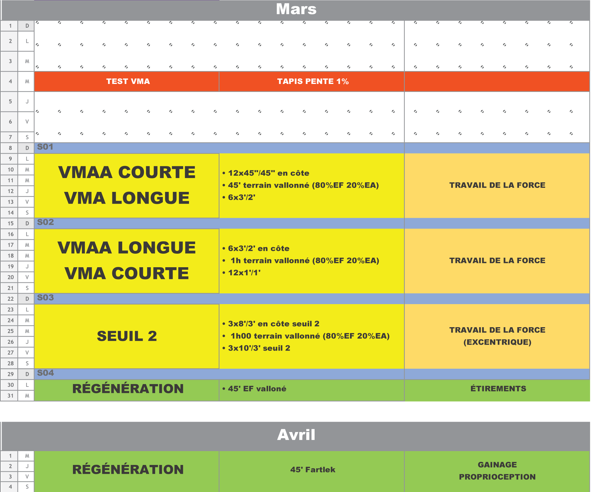 D’une semaine à l’autre on alterne avec VMA et VMAA courte et longue, sur plat ou en côte, une séance de côte au seuil 2 et pour terminer une sortie longue avec une répartition équilibrée entre EF et EA. J’augmenterai les charges au fil des semaines.