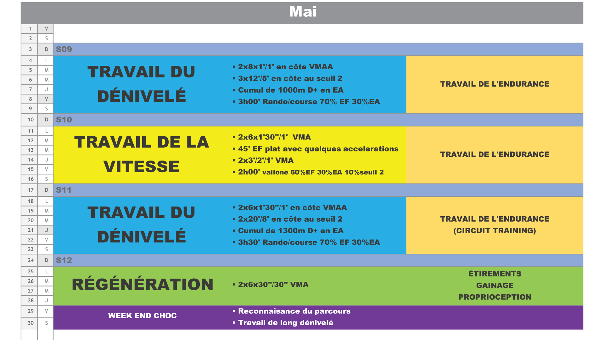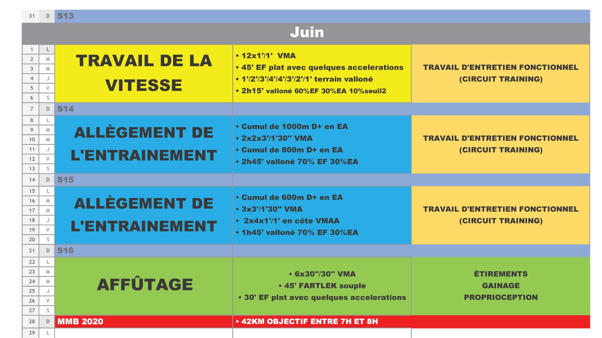 Après une longue période de travail de dénivelé, on attaque la semaine 13 avec de la vitesse histoire de ne pas perdre les qualités acquises jusqu’ici. Dès la semaine 14 on commence à alléger progressivement le volume et la charge d’entrainement jusqu’à la dernière semaine destinée à l’affûtage qui se résumera à une petite session de VMA courte, quelques footings légers et quelques accélérations pour arriver frais le jour de la course.