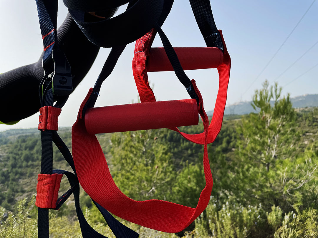 Le principe est donc simple, il s’agit d’une sangle réglable en longueur avec deux poignées, prolongées par deux anneaux juste en dessous pour y glisser les pieds ou les coudes.
