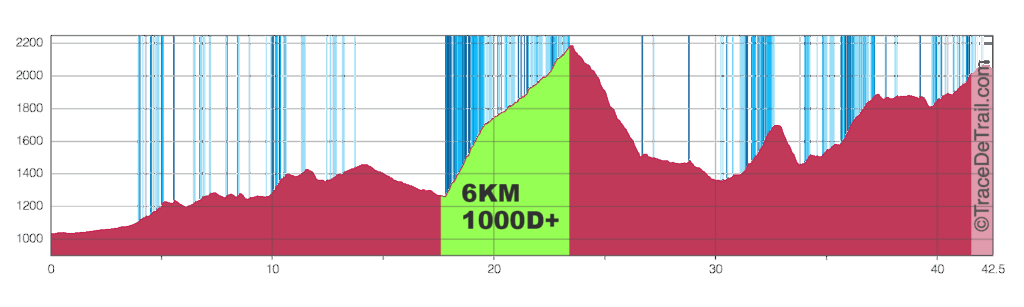 Par exemple si nous prenons l’exemple du 42km du marathon du Mont Blanc, lorsqu’on analyse le profil de course on réalise très vite qu’il y a des phases ascendantes longues comme cette portion en vert que tu peux visualiser ci-dessous et qui comptabilise près de 6km pour 1000m de D+. Si à ce moment-là tu présumes de tes conditions physiques et bien tu auras tout simplement deux bouts de bois à la place des jambes tant la concentration de lactate sera importante dans ces dernières. Il faut de plus penser aux kilomètres restant en assurant les descentes et les parties roulantes.