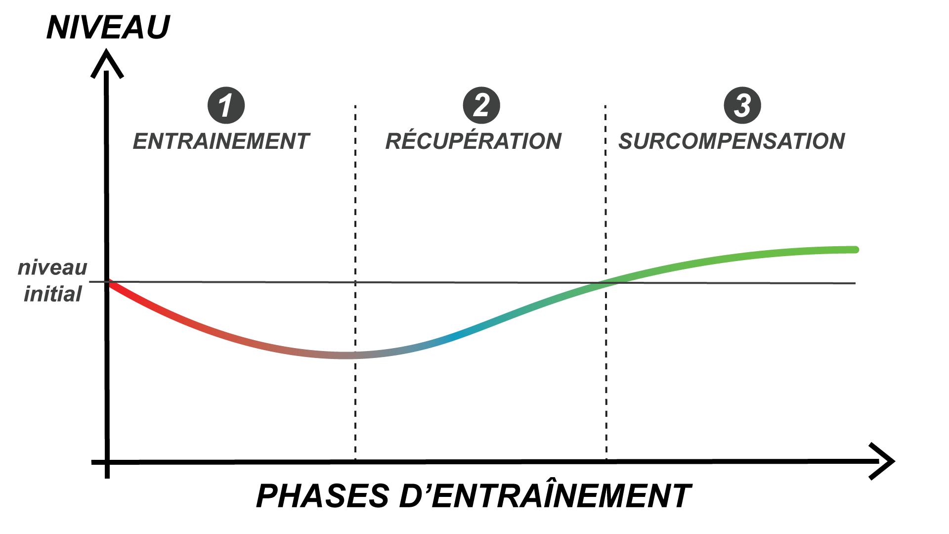 Pour résumer rapidement, l’entrainement stresse notre organisme, cela créé une fatigue que l’on surmontera grâce à la récupération et une récupération optimiser fait place à la surcompensation, c’est-à-dire ce moment où l’on devient plus fort, où l’on dépasse son niveau initial.