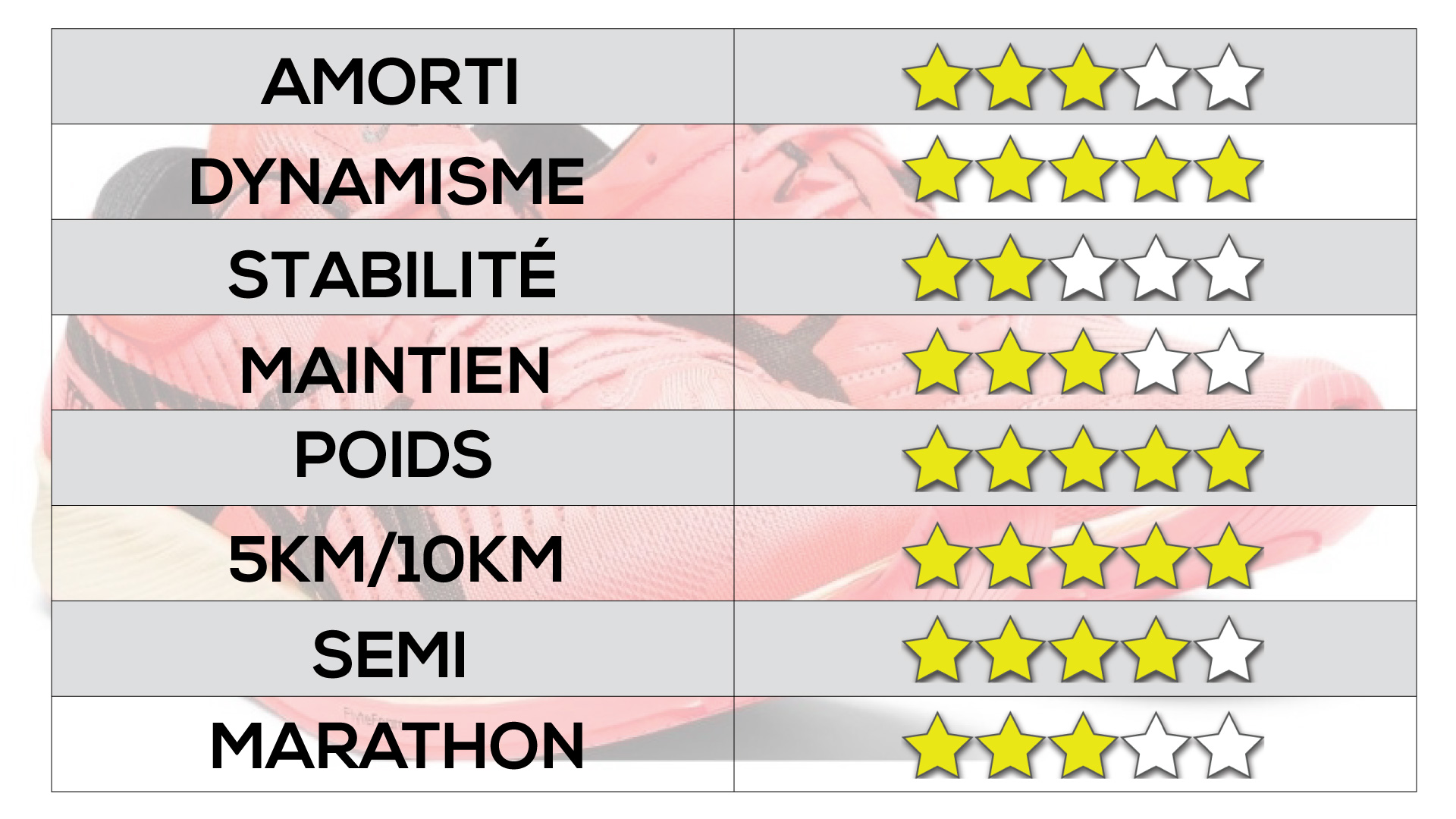Enfin, en tant qu’amateur, j’utiliserais plus ce modèle sur des distance allant de 5km jusqu’au semi-marathon maxi, car au-delà, je pense que je risquerais clairement de subir la chaussure plutôt que de l’exploiter.